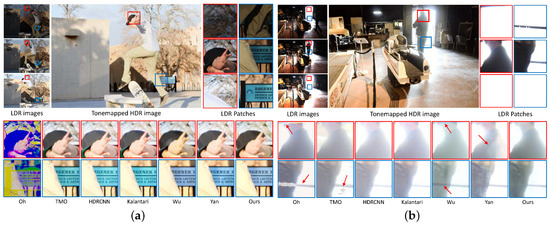 Figure 7 presents visual comparisons of HDR images for the proposed method and the state-of-the-art methods on the testing set of datasets without ground truth [11,24]. Oh et al.’s [28] method cannot detect large object motion, resulting in large ghosting artifacts in Figure 7a. The methods relying on single images [17,22] and Kalantari et al.’s method [19] exhibit similar color distortions for both datasets. Wu et al.’s method [20] yields color distortions and ghosting artifacts. The method proposed by Yan et al. [21] fails to preserve color consistency and generates ghost artifacts due to misalignment. In contrast, our method generates visually plausible results preserves details and color consistency without ghosting artifacts.