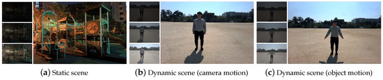 - Gallo, O.; Troccoli, A.; Hu, J.; Pulli, K.; Kautz, J. Locally non-rigid registration for mobile HDR photography. In Proceedings of the IEEE Conference on Computer Vision and Pattern Recognition Workshops, Boston, MA, USA, 8–10 June 2015. [Google Scholar]