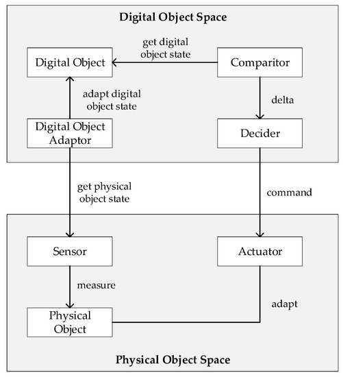 The application of digital twins is in essence a control system activity to enhance the intelligence of the system and the overall decision-making process herein. As such, the notions of control and smart systems appear to be essential. A model for a control system is shown in Figure 5 (based on [1,24,25]). In the figure, the rectangles represent control entities, while the arrows represent control flows.
