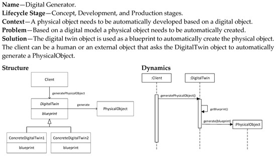 The Digital Generator pattern (Figure 8) is similar to the Digital Model pattern in that it defines the production of a physical object based on a digital model blueprint. The difference is that the production is now automated and human intervention is thus not needed. The implementation of this pattern requires therefore also the implementation of the generation process that takes as an input the digital blueprint and provides as an output a physical object or part of the physical object. The automated production of the physical object could be based on techniques as defined in model-driven development.