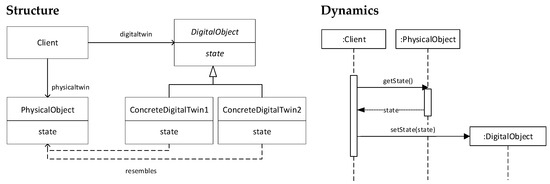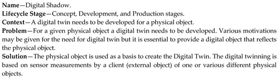 The Digital Shadow pattern (Figure 9) provides a digital twin based on the physical object. Hence, it assumes already the existence of a physical object. Multiple different digital twins can be generated for one or more physical objects, based on the defined system requirements. The implementation of this pattern requires that the physical object is equipped with the necessary sensors to derive the information that needs to be modeled by the digital twin. In principle, the development of a digital twin based on a physical object could be also a manual process, which would be considered a kind of manual reverse engineering process.