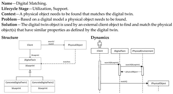 The previous three patterns focused on the creation of a physical object based on a digital twin (Digital Model, Digital Generator), or vice versa (Digital Shadow). The creation is either manual or automatic. In the Digital Matching pattern we assume an existing digital model that is used to find physical objects that match the properties of the digital model. The addressed problem is thus not creation, but search (physical object) and match (with digital twin). Typical applications of this pattern are, for example, classification and object recognition applications using machine learning or deep learning approaches. The pattern is shown in Figure 10. This pattern is related to the utilization and support stages of the systems engineering lifecycle. The matching process is assumed to be automatic. Therefore, this pattern requires the implementation of search, classification, and object recognition algorithms.