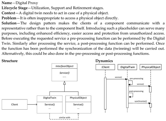 The Digital Proxy pattern (Figure 11) is also a pattern that is applied in the utilization and support stages. The pattern provides a digital twin that is used as a proxy for the physical object. This means that all the communication directed to the physical object is captured by the digital twin, which acts and responds in the name of the physical object. Hence, the digital twin can provide pre-processing and post-processing of the required services. Multiple different digital twins can be developed based on the different needs for communication, pre-processing and post-processing.