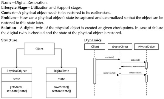 The Digital Restoration pattern (Figure 12) is applied when the physical object needs to restore its earlier state. This could be needed due to failures, loss, corruption, or to align with the state of other physical objects and the environment state. The state of the physical object is reflected on the digital twin at defined times. In the case in which restoration is needed, the process is reversed and the state of the digital twin is used to restore the state of the physical object. The pattern is applied in the utilization and support stages.