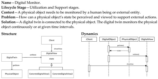The Digital Monitor pattern (Figure 13) is used to provide a digital twin that monitors a physical object. One digital twin can in essence monitor multiple physical objects, and a physical object can also be monitored by multiple twins. Hence, the relationship between digital twin and physical object is many-to-many.
