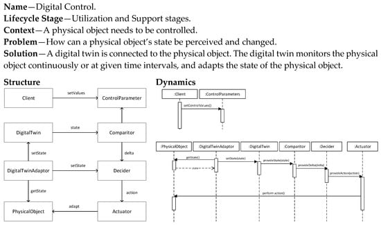 Based on the higher-level model of the digital twin Figure 4 and the control model of Figure 5, we now provide the digital twin model as shown in Figure 6. In essence, a digital twin is thus considered a control system, but the control is now carried out in the digital object space. The model itself will be used to illustrate the digital twin patterns in the following sections.