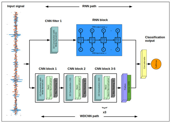 In this paper, a novel dual-path deep learning network, combining a recurrent neural network path and a deep convolutional network path (RNN-WDCNN) is proposed and applied to fault diagnosis for rolling element bearings. This model architecture, shown in Figure 3, is inspired by the Long-Short Term Memory Fully Convolutional Network (LSTM-FCN) architecture proposed by Karim et al. [38]. LSTM-FCN has been shown to perform well across a range of benchmark tasks in time-series classification [39]; however, the small kernel size in the first convolutional layer hampers the ability of the fully convolutional network path to capture distant dependencies in the raw temporal signals from the noisy machine operating data (e.g., the raw vibration signals for bearing fault diagnosis used in this work). This problem is even more pronounced when these signals are sampled at a high sampling rate as the parts of interest in the signal are correspondingly further apart. As well as this, the relatively shallow nature of the convolutional pathway (using three convolutional stages) restricts the ability of the network to capture complex representations of low-level features.