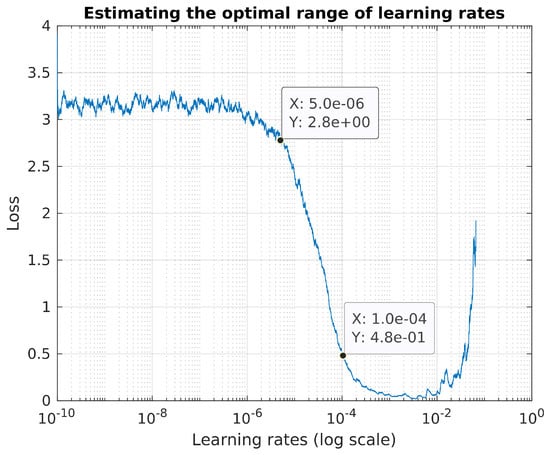 The range of the learning rates for the CLR strategy was chosen by gradually increasing the learning rate from very low () to very high (10) and plotting the behavior of the loss value. The maximum and minimum (i.e., base) learning rates were then chosen as the points between when the loss decreases most sharply, as shown in Figure 4. Learning rates were adjusted between the base learning rate and the maximum learning rate using the triangular2 policy (whereby the maximum learning rate is halved after each cycle), with the step size chosen so that there would be three cycles over the course of the training process (with the training process finishing at the end of the third cycle). A batch size of 8 was used during this training process as small batch sizes have been shown to improve the generalization performance of a trained model by helping the optimizer converge to flatter minima in the search landscape [43].