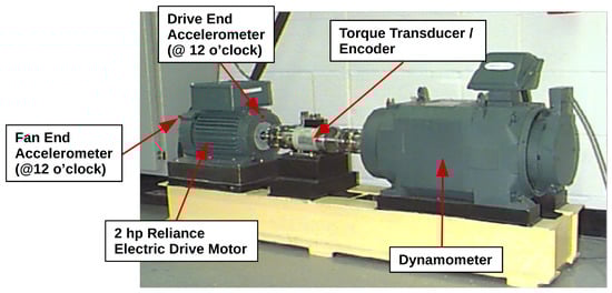 To validate the effectiveness of the novel dual-path recurrent neural network with wide first kernel and deep convolutional pathway proposed in this work for intelligent data-driven fault diagnosis applications, the benchmark bearing fault dataset from Case Western Reserve University (CWRU) Bearing Data Center [46] is used. The CWRU bearing fault dataset has been widely used in the literature for investigating both conventional fault diagnosis techniques [47,48] and data-driven fault diagnosis methods using machine learning [49,50] and deep learning [35,36,37]. The data used in this study were collected from both the drive end accelerometer (close to the fault location) and the fan end accelerometer (remote from the fault location) of the test apparatus shown in Figure 5. Data were collected over a range of motor loads (from 0 hp to 3 hp) and for a variety of single point damage conditions, with bearing damage introduced by using electro-discharge machining (EDM) to induce faults of varying types and severity (see Table 2 for a list of fault conditions).