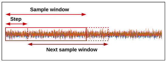 One drawback of deep learning models is their need for large amounts of data for training the model; however, in fault diagnosis applications it is rare to have large amounts of data due to the inherent difficulties in running machinery in fault conditions for prolonged periods of time. In this study, data augmentation was used to increase the amount of training data available to train the model and help reduce over-fitting. To do this, a sliding window approach was used to extract multiple overlapping samples from the input sequences (as shown in Figure 6). Each input sequence was acquired under a single fault condition, so the augmented sequences were all assigned the same fault label as the original input sequence. The experiments in this study use a window length of 4096 data points and a step size of 64 to create the training data. A window of 4096 data points was chosen to capture at least two complete revolutions of the load-bearing shaft—i.e., the rotating motor shaft—and therefore impacts on the bearing fault area. The number of data points in a complete revolution of the load-bearing shaft is given by (where N is the number of data points, is the sampling frequency, and is the rotating shaft speed in rpm). As Table 3 shows, the rotating shaft speed varies between 1772 rpm and 1730 rpm for the operating conditions investigated in this work. At a sampling rate of 48 kHz, this gives between 1626 and 1665 data points per complete revolution which means a window length of 4096 data points is guaranteed to capture at least two bearing fault impacts. This approach is similar to that taken by other works in the literature that use the 12 kHz sampled data [35,36]. The test data was created using the same window length but without samples overlapping. The labels for both the training and testing datasets were evenly distributed between the fault classes (as shown in Table 4) for each of the load conditions.