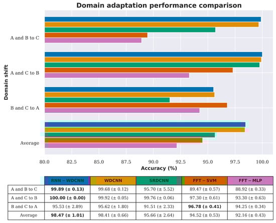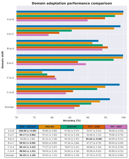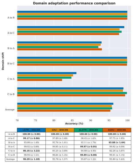 Table 5 provides details of the arrangement of the datasets used in this scenario. As mentioned in Section 4.1, the data used for training has been augmented using a sliding window approach, and the data used for testing (the target domain in Table 5) is split into non-overlapping windows of the same length as the training samples. Figure 7 shows the differences in performance in this scenario between the four versions of RNN-WDCNN considered in this work (i.e., models using the GRU, LSTM, AGRU, and ALSTM based recurrent pathways).