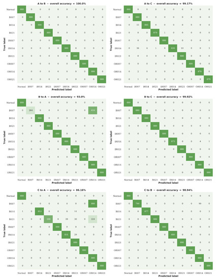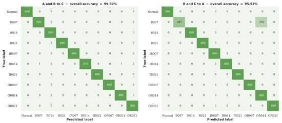 Figure 11 shows two of the confusion plots for the proposed RNN-WDCNN model in this domain adaptation scenario (the case of unseen dataset B is omitted, since RNN-WDCNN obtains 100% accuracy under these conditions). It can be seen that, although the use of data from multiple operating conditions significantly improves the classification performance (particularly with respect to the classification of severe rolling elements faults—fault B021), in the more difficult case (training on datasets B and C and testing on unseen dataset A) RNN-WDCNN still often mistakes minor rolling element damage in dataset A (fault B007) for moderate outer raceway damage (fault OR014). This lends weight to the hypothesis that the data for minor rolling element damage under 1 hp load in the CWRU dataset also contains an undiagnosed outer raceway fault (as discussed in Section 4.2.1, above).