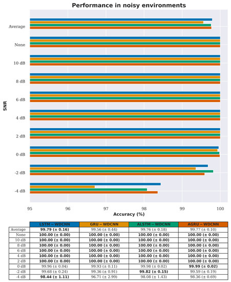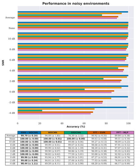 Figure 13 and Table 13, Table 14 and Table 15 show a comparison of the noise rejection performance between the proposed RNN-WDCNN model, the two state-of-the-art deep learning-based models (WDCNN and SRDCNN), and the two FFT based methods (FFT-MLP and FFT-SVM). It can clearly be seen that, under small amounts of noise, all the algorithms perform well (with better than 90% accuracy when the signal-to-noise ratio is 4 dB or greater). However, as the noise level increases, RNN-WDCNN significantly outperforms the other algorithms—achieving better than 98% accuracy at a signal-to-noise ratio of −4 dB.