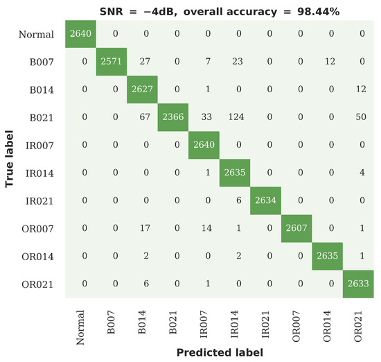 Figure 14 shows the confusion plot for the proposed RNN-WDCNN model under the most severe noise conditions considered in this experiment (i.e., when the SNR is equal to −4 dB). It can be seen from Figure 14 that the largest effect of the introduction of noise on the classification accuracy of RNN-WDCNN is in the consideration of rolling element faults. This may be partly because, as Smith and Randall [48] have shown (and as discussed in Section 4.2.1 above), many of the rolling element faults in the CWRU Bearing Fault data also exhibit signs of inner and outer raceway faults and the addition of noise may act to obscure the true fault condition. However, even under this severe noise condition, the classification accuracy of RNN-WDCNN is excellent (with greater than 98% accuracy).