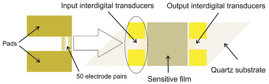 A typical “delay line” SAW sensor, as can be seen in Figure 1 [44], consists of an input IDT and an output IDT, both deposited on the piezoelectric substrate of the sensor [30,45]. The surface between the two IDTs is the sensitive surface, onto which a layer is deposited, for the interaction with the analyte. The interaction with the analyte on this area leads to the formation of a delay in time between the input and output signals, which depends on the length of the sensitive layer and the velocity of the SAW [30,31].