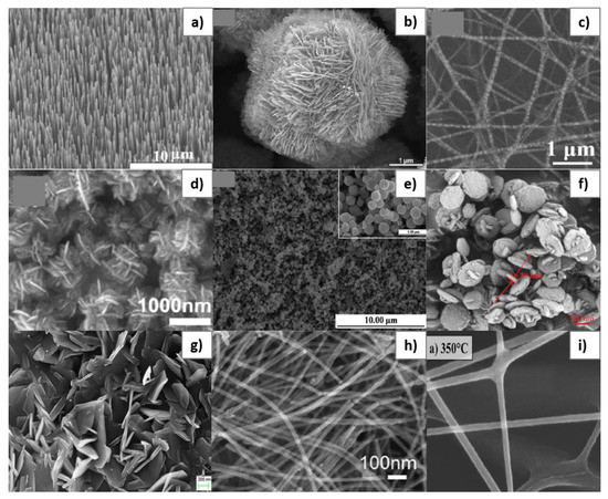 Scanning Electron Microscope (SEM) images for different types of morphologies obtained for ZnO: nanorods (a) [122], nanosheets (b) [132], nanotubes (c) [133], nanoflowers (d) [1], microspheres (e) [134], nanoplates (f) [113], nanoflakes (g) [135], nanowires (h) [136], and nanofibers (i) [137]. Reproduced (2020) with permission from Elsevier and ACS Publications.