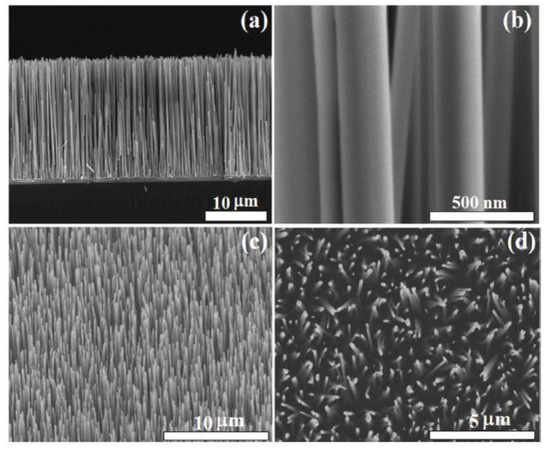 Field scanning electron microscope (FESEM), cross-section of ZnO-Nanoroads (NRs) (a), closer cross-sectional view of ZnO-NRs (b), 25° lateral (c) and top view of ZnO-NRs [122] (d). Reproduced (2020) with permission from Elsevier.
