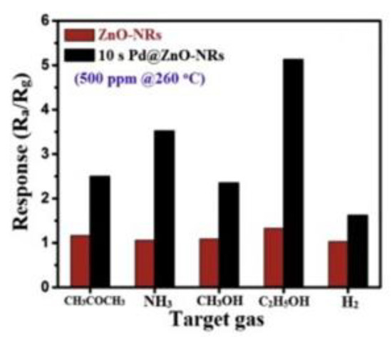 The selectivity of ZnO and Pd@ZnO nanorod sensors at 500 ppm concentrations of different types of gases. [122]. Reproduced (2020) with permission from Elsevier.