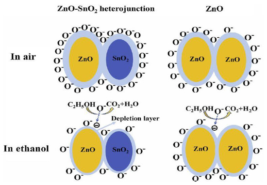 Scheme of the proposed detection mechanism for ZnO and ZnO-SnO2 [99]. Reproduced (2020) with permission from Elsevier.