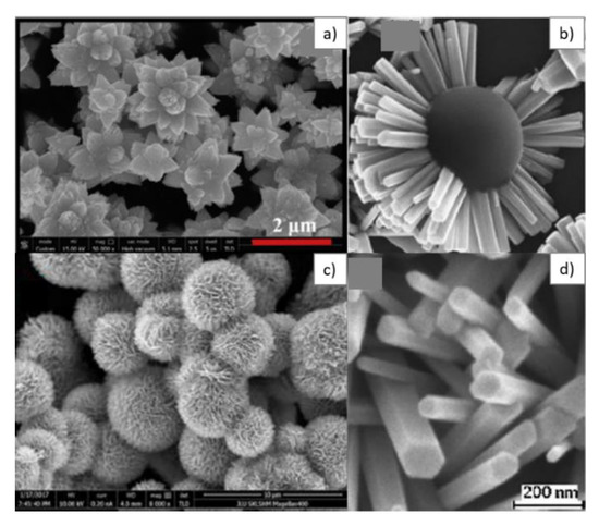 SEM images for ZnO obtained by the hydrothermal method for different morphologies: nanoflowers (a,c) [84,164], nanowires (b,d) [91]. Reproduced (2020) with permission from Elsevier.
