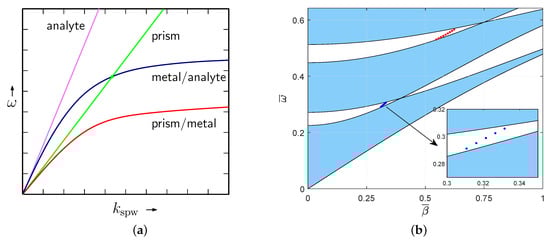 To illustrate the SPW excitation under the phase matching condition given by Equation (2), we consider a metallic layer, a glass prism and an analyte (air). The corresponding dispersion of the SPW at the metal–analyte interface is shown in Figure 2a by the blue line which crosses the line for the light wave in the glass prism by the green line so that the SPW is excited. When the light wave in air is considered as shown by the violet line, no crossing is present and the SPR does not occur. Similarly, the SPW is not excited at the prism–metal interface.