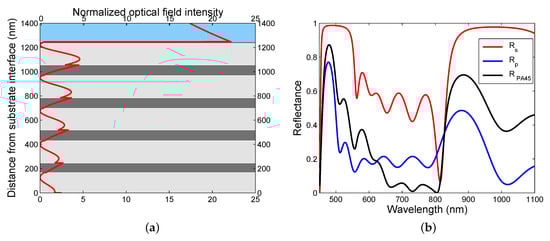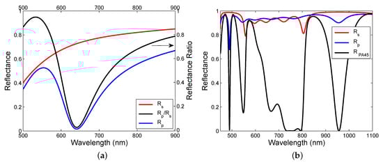 Similarly, to illustrate the BSWR phenomenon for a real case, we consider an MDS studied previously []. The MDS is shown in Figure 3b and is represented by a system of four bilayers ( 1, …, 4) of TiO/SiO with thicknesses 166.7, 182.8, 179.0, and 183.9 nm, and 79.9, 89.2, 86.6, and 87.2 nm, respectively, and a termination layer of TiO of thickness 177.4 nm with a rough layer of thickness 13.5 nm. A standard approach in the refractive index sensing, which is based on measurement of the reflectance of a p- or s-polarized wave, a TM or transverse electric (TE) wave, usually fails because resolving the corresponding reflectance dip is not possible due to a shallow resonance dip []. Thus, we proposed a new approach [] utilizing the spectral interference of the polarized waves reflected from the MDS, and the BSW resonance dip can be resolved with maximum depth. The interference is attained when both the polarizer and analyzer are oriented with respect to the plane of incidence, and the corresponding reflectance is expressed as