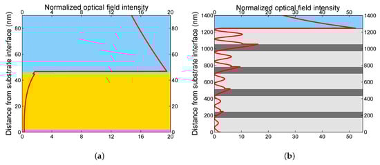 To confirm the SPR, the optical field intensity in the MPS divided by , where is the incident p-polarized electric field, is shown in Figure 5a for an angle of incidence of and a wavelength of 641.6 nm. Optical field enhancement in the gold layer and the localization of the wave on the surface are apparent from this figure. Similarly, to confirm the BSWR in the short-wavelength band gap (BSW1), the same quantity in the MDS is shown in Figure 5b for an angle of incidence of and a wavelength of 489.2 nm. The SPW exhibits nearly a twenty-fold enhancement, while the BSW1 shows more than a fifty-fold enhancement, and an exponential tail of the wave in the analyte (air) is decaying slower for the SPW than for the BSW1. In addition, to confirm the BSWR in the long-wavelength band gap (BSW2), the normalized optical field intensity in the MPS is shown in Figure 6a for the same angle of incidence and a wavelength of 955.4 nm. The BSW2 exhibits nearly a twenty three-fold enhancement and a slower exponential decay of the wave than for the BSW1. Thus, both the MPS and MDS have the potential to be employed in sensor applications. It should be stressed that four bilayers in the MDS are not optimal as in the case of a semi-infinite MDS, as demonstrated by different shapes of the field envelopes within the MDS shown in Figure 5b and Figure 6a. Fortunately, the sensing applications are still possible.
