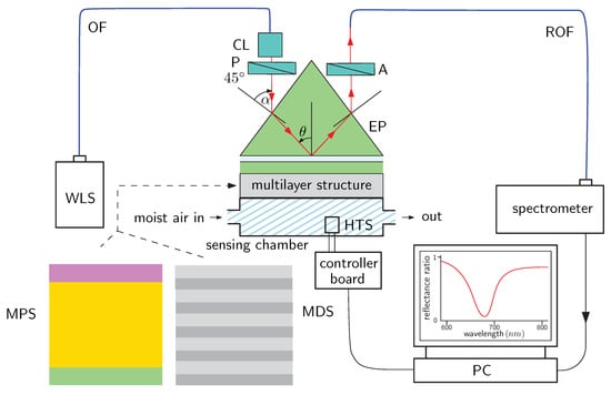 An experimental setup used to measure the reflectance response of multilayer structures with the RH change, or equivalently with the change in the refractive index of moist air, is shown in Figure 7. It comprises a white-light source (WLS) (halogen lamp HL-2000, Ocean Optics, Dunedin, FL, USA) terminated by launching optics, to which an optical fiber (OF) with a collimating lens (CL) are connected. The beam from the collimating lens is 1 mm diameter and next is a linear polarizer (P) (LPVIS050, Thorlabs, Newton, MA, USA). Its orientation is with respect to the plane of incidence, and both polarization components, p and s, are generated. The beam is coupled to a multilayer structure on a glass slide using an equilateral prism (EP). The light reflected from the multilayer structure passes through a linear analyzer (A) (LPVIS050, Thorlabs) oriented and , or with respect to the plane of incidence so that the reflectances and , or are measured. A read optical fiber (ROF) (M15L02, Thorlabs) is used to launch the light directly into a spectrometer (USB4000, Ocean Optics), which is connected via USB to a personal computer (PC).