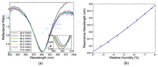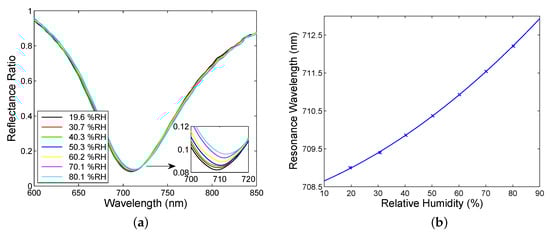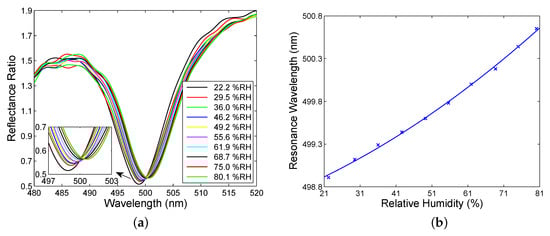 Spectral reflectance ratio for different values of the RH of moist air measured for the MPS (a). Resonance wavelength as a function of the RH of moist air with a polynomial fit (b).