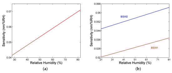 Sensitivity as a function of the RH of moist air for SPR (a), and for two BSWs (b).