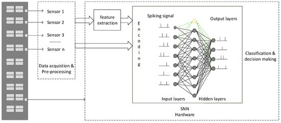 Considering these issues, SHM Systems should offer three characteristics. Firstly, the system should be adaptive, robust and capable of learning quickly. Secondly, the data analysis of the SHM system should be fast, efficient and accurate. Finally, the longevity and reliability of the systems hardware should be enhanced as the SHM system may be deployed in harsh conditions. The SHM system must have protection capabilities to resist the hazardous effect of the external environment. Recent research suggests that we can build a human brain-like, fault-tolerant, energy-efficient system with learning capability to enhance the robustness, productivity and endurance of the electronic hardware systems [6,7]. Spiking neural networks (SNN) are referred to as the 3rd generation of artificial neural networks (ANN). Contrary to conventional ANNs, SNNs are more realistic mathematical representations of the human brain that mimic biological spike-based event-driven processes to communicate between neurons. SNNs are more computationally complex and powerful than conventional ANNs [8]. On an embedded processor, these digital systems’ spike-driven communication capability makes SNNs, that is, the astrocyte-neural network model, more energy-efficient and reliable than deep neural networks [9]. Therefore, this paper proposes an SHM system that is based on SNN hardware to address the challenges of longevity and reliability of the monitoring system. The acceleration data collected from a full-scale seven-story reinforced concrete building are analyzed and the severity of the damage to the building is subsequently classified. The proposed system can monitor and detect the structural health damage levels under different environmental conditions and provide a high detection accuracy and relatively low hardware overheads for implementation.
