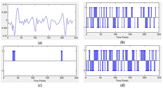 Spike trains generated by three different coding schemes. (a) Data stream of a channel; (b) Encoding with Address Event Representation (AER); (c) Encoding with Bens Spike Algorithm (BSA); (d) Encoding with Step Forward (SF). Note that spikes in (b), (d) are positive or negative but there are only positive spikes in (c).