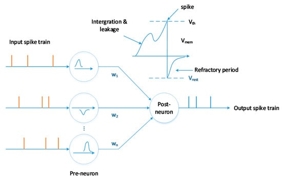 Different spiking neuron models can be used to model spike generations at different description levels of biology [9], such as leaky integrate-and-fire (LIF), Izhikevich and Hodgkin–Huxley. The LIF neuron is one of the simplified models, which can be modelled as: