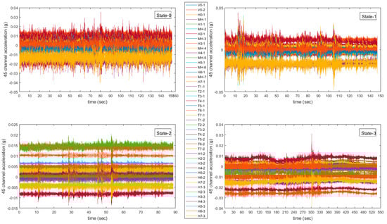 The raw data collected from 45 channels in the building at different health states are shown in Figure 4. Raw accelerometer data of different structure states show different features, such as maximum amplitude and mean value and so forth. By considering the building’s physical movements in different states [33], the deformation degree of buildings can result in large differences in the mean and fluctuation range of the accelerometer data. Based on this analysis, zero-crossing rate, mean and variance are used for feature extractions.