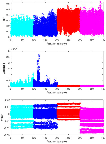 After the data have been pre-processed, three methods (including zero-crossing rate, variance and mean value) are used to extract data in order to select the damage-sensitive features. The features are presented in Figure 5. The zero-crossing rate, which is the rate of sign-changes along a signal, is too weak to separate the different damage states (indicated by colors). Among them, calculating the mean value of the sensor data has the potential to differentiate the four damage states.