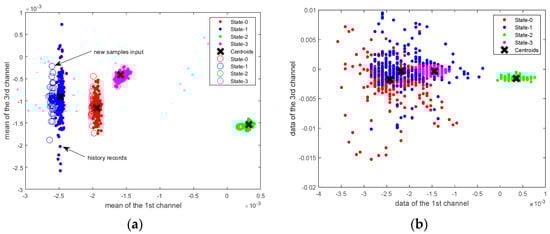 It can be seen from Figure 6a that using the mean value of the data as an input of the k-means algorithm can classify the health status of the building. The dots represent historical records and the circles represent new data inputs. The classification accuracy of the structural health status is 100%. In Figure 6b, the raw data are used directly as the input of the k-means algorithm. In the case of overlapped data, including State-0, State-1 and State-3, the k-means algorithm cannot separate these data. There are 45 channels in total and only two of them are used for the demonstration in Figure 6.