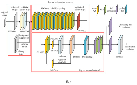 As is shown in Figure 1b, the proposed model contains three parts: IR image enhancement, feature optimization network, region proposal networks. Feature optimization network takes artificial feature maps as input and output a further optimized feature map. This part has a structure similar to VGGNet, with the architecture parameters, as shown in Table 1. Feature optimization network is vital, since the artificial features are not perfect enough for classification. The region proposal network employs two convolution layers to generate the object map with 18 channels, uses a softmax layer to pick up proposal regions, and uses a regression branches to adjust the positions and sizes of the proposal regions [40]. Finally, two full connection layers with 4096 units, one with 21 units and one with 84 units, are used to output the bounding boxes and classes.