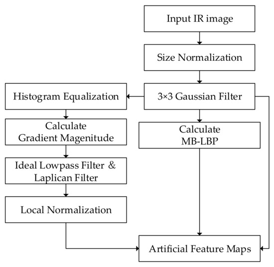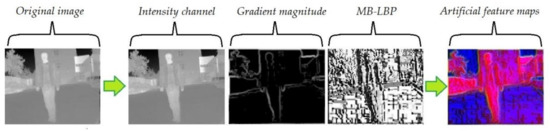The algorithm of feature channels expansion is shown in Figure 2 and Figure 3. Bilinear interpolation is first used to normalize the size of the image. A 3 × 3 Gaussian filter is employed to suppress the noise in the original images. Then histogram equalization is performed to improve the contrast of the IR images. Therefore, the gradient feature is enhanced and can be extracted effectively [43]. The performance of the gradient extraction can be affected by serious noise, which is suppressed by an ideal lowpass filter and a Laplacian filter. Then an intensity local normalization is carried out on the gradient map, in order to minimize the effect of the intensity-level changes [41]. MB-LBP feature map is calculated, according to the method introduced in Section 3.1.2. The artificial feature maps are generated by arranging these two maps together with the original intensity distribution, thereby serving as the three channels of the output image.