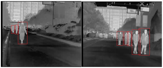 CUSTFIR is a dataset obtained by our team with an automotive IR camera developed by iRay Technology, in Shanghai, China. The IR camera has a resolution of 352 × 288 and a sampling frequency of 25 Hz. This dataset contains both daytime and nighttime sequences. There are 2836 images with 6408 pedestrians included. All images are recorded with a one out of 10 sampling. The ground truths of this dataset are annotated manually by four different volunteers. The dataset contains two different scenes with irregular background, such as trees, cars, buildings, and sky. The two scenes are on different roads of Changchun University of Science and Technology. The datasets contain sequences of both winter and summer, and it contains sequences of both day and night. Some examples of CUSTFIR pedestrian dataset are shown in Figure 7, where the red boxes are the ground truth.