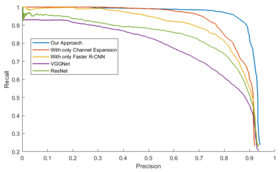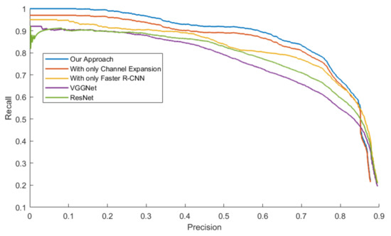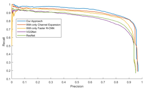 Figure 14, Figure 15, Figure 16 and Figure 17 exhibit the PR Curve with precisions as the abscissa against recalls as the ordinate on LSIFIR, CVC-14, SCUT, CUSTFIR datasets. Each figure contains three curves of the proposed approach, the model with channel expansion only, the model with Faster R-CNN only, and other baselines like ResNet and VGGNet. It can be observed that the performance of the approaches converges in the low precision area, but tends to be different in the optimal area and the low recall area. In general, the average performance of the proposed approach is better than that of the original model, since the area under the PR Curve (AUC) of our approach is larger than that of the original model. This is because the models of our research provide more pedestrians detected, when keeping the accuracy and the same possibility of making mistakes. This proved the assumption that appropriate expert-driven approaches can help with the extraction of CNN features and accelerate the training process of the model.