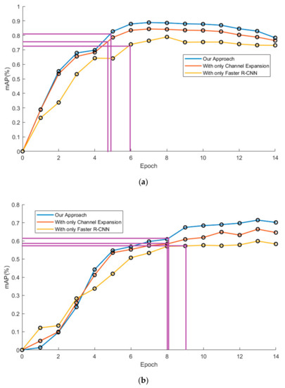 Figure 18 shows the mAP against the epoch curve by three models on two typical datasets. In order to show the progress in the model training time, it’s defined in this research that the time for comparison is the time when the curve reaches 90% of the final average mAP value. It is clear that the training of models with channel expansion is one epoch faster than that of the original one, according to the guidelines in purple. In addition, the curves of our approach flatten sooner than the curves of the original models. This demonstrated that our approach could accelerate the training process without additional data. It can also be seen that the curves of our approach tend to decrease at the end of the training, instead of maintaining their level. This may be because the model of our approach is more likely to be overfitted with excessive data.
