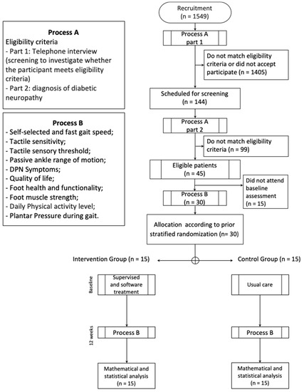 The present work presents the results of a feasibility study involving a superiority RCT and preliminary efficacy analysis of a 12-week therapeutic foot-ankle exercise program for people with DPN [30]. It is also our intention with this paper to stress the use of biomechanical sensors to guide therapeutic strategies and rehabilitation of the dysfunctions related to DPN. These sensors are neither regularly applied to this population nor applied in clinical settings where this population is treated. Thus, besides the feasibility purposes, we aimed to emphasize the importance of the biomechanical sensor for trials that focus on therapeutic strategies for musculoskeletal deficits in the diabetic population. The parameters investigated were derived from biomechanical sensors and other clinical tools: foot functionality and clinical and biomechanical outcomes, such as gait speed, foot strength and plantar pressure during gait, as well as the aspects of recruitment, adherence to training protocol and participant satisfaction.