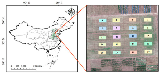 The experiment of different treatments of fertilizers to maize was conducted in Nanpi Eco-Agricultural Experimental Station (NEES) (38.00°N, 116.40°E), which was managed by the Chinese Academy of Sciences (CAS) (Figure 1). The NEES was in Hebei Province belonging to the North China Plain (NCP), which was the national main grain product areas of summer maize and winter wheat. The general growth duration of maize was from middle June to early October in a single year. There was a total of 20 plots in this area, and each plot was treated using different amount of fertilizers containing the common usage of nitrogenous fertilizer, phosphate fertilizer, and potassium fertilizer, respectively (Table A1). The study area was in the semi-humid monsoon climate zone, and the annual average temperature and average annual precipitation is 12.3 °C and 480 mm, respectively. The soil type of this region belonged to the cinnamon soil subgroup. The parent material of this soil species was deep and uniform, of which the profile is A-AB-BK. The A layer (0–20 cm) was desalinated Chao soil, with some saline soil. The AB layer (20–48 cm) was sandy coarse loam with a granular structure and the BK layer (48–100) was clay loam with weak adhesion. The soil in NEES represented the typical type of water-salt salinization in this region.
