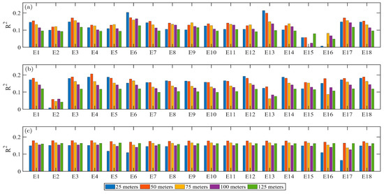 For the experiment conducted on 16 July 2020. The VI were all used to build linear regression relationships with the values measured by SPAD-502. Again, the results showed that the images acquired from flight altitude of 50 m were the least influenced by the scale impacts, where the R2 from 50 m were the highest compared with the R2 from other flight altitudes, respectively (Figure A3). The average values of R2 were 0.040, 0.043, 0.038, 0.031, 0.033 for 25, 50, 75, 100, 125 m, respectively. Thus, the images acquired from 50 m were least influenced by the scale impacts from different flight altitudes.