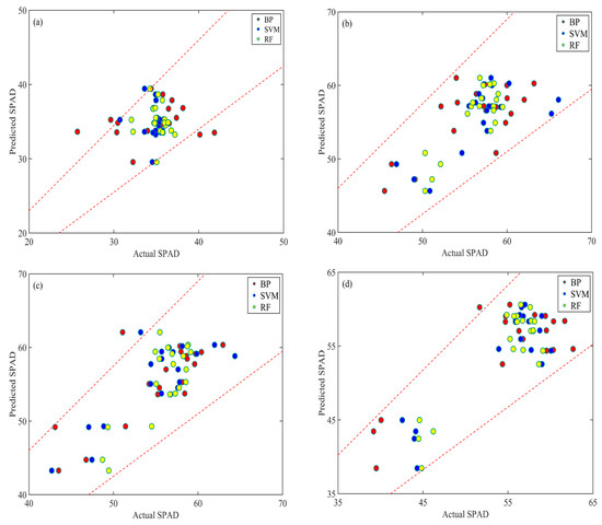 Chlorophyll contents predictions using ML methods. The red, blue, and yellow points are the predicted values of the chlorophyll contents using BP, SVM, and RF, respectively. (a–d) represents the results using images acquired on 8 July, 18 August, 1 September, 16 September 2019.