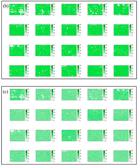 The 18 VI were used to build linear relationships with chlorophyll contents in each plot for different flight altitudes (Table A2, Table A3, Table A4). For the data acquired on July 8 in 2019, the crop binary map at flight altitude 50 m using EXR-EXG method is shown in Figure A1. The results of R2 between VI and SPAD values using images acquired from different flight altitudes on 8 July 2019 were each obtained and compared (Figure 2). It can be concluded that the R2 calculated using E 6 and E 13 performed better (Figure 2a). The percentage of VI with corresponding of the R2 increased from flight altitude of 25 to 50 m and gradually decreased from flight altitude of 50 to 125 m were 44% and 50%, respectively (Figure 2a,b). Thus, the proposed second approach was better than the first approach, and the significantly increased R2 had indicated that the elimination of effects of background had improved the accuracy to some extent. The results in Figure 2b had removed the disturbance of background such as soil. When the HSV color space was applied, the percentage of VI of R2 increased from 25 to 50 m has increased to 100%, which implied that the images in HSV color space system were better for information extraction than the traditional RGB color space system, especially for estimating the chlorophyll contents.