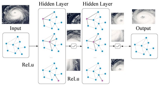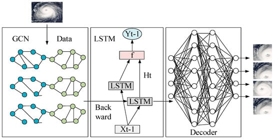 The entire GC–LSTM model combines the advantages of the two models: LSTM network and GCN. LSTM is used to learn the timing information of the connected state of each node, and GCN is used to learn snapshots at every moment. The structural characteristics of the network make it capable of effectively processing high-dimensional, time-dependent, and sparse structural sequence data. This model is easy to build and train, and can adapt to different network applications. Also, the accurate prediction of typhoon levels can be achieved. The specific structural framework is shown in Figure 7.