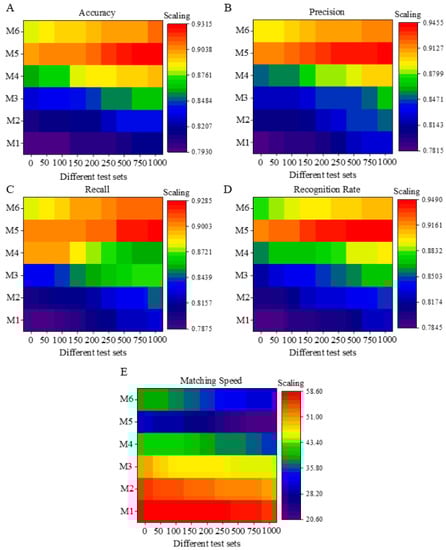 Performance comparison results of different models (Note: M1 is the ANN model, M2 is the Recurrent Neural Network (RNN) model, M3 is the GCN model, M4 is the LSTM model, M5 is the GCN–LSTM, and M6 is the RNN–LSTM model, where 0–200 is the test set and 200–1000 is the training set). Figures (A–E) show the performance results of different algorithms in accuracy, precision, recall, recognition rate, and processing speed under different test sets.