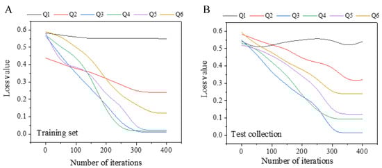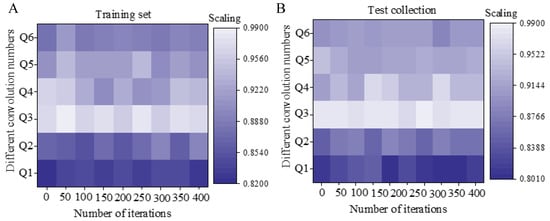 Feature extraction effect of different number of convolution kernels (Note: Q1 (1 × 1 convolution kernel), Q2 (3 × 3 convolution kernel), Q3 (5 × 5 convolution kernel), Q4 (7 × 7 convolution kernel), Q5 (8 × 8 convolution kernel), and Q6 (9 × 9 convolution kernel)). Figure (A) shows the feature extraction effect under different numbers of convolution kernels on the training set; Figure (B) shows the feature extraction effect under different numbers of convolution kernels on the test set.