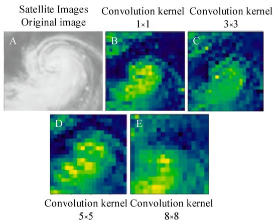 It is illustrated in Figure 10 that compared to the convolution kernel numbers of 1 × 1 and 3 × 3, when the convolution kernel number is 5 × 5, the neural network has a high processing efficiency for the satellite cloud picture. The 5 × 5 convolution kernel has obvious feature extraction effects for typhoon eye, cloud wall, and spiral cloud belt (yellow area), but the 8 × 8 convolution kernel will increase typhoon similar redundancy and thus lose local features. Compared with the original image of the vortex cloud area, it is found that the model is more sensitive to the yellow area, but not sensitive to the fibrous cloud at the edge of the typhoon. Therefore, adding the model to the yellow area feature extraction is beneficial to the classification of the model. This is consistent with the truth that many scholars predict typhoons by locating typhoon eyes, segmenting dense cloud areas, and extracting spiral cloud belt features. This also proves the feasibility of classifying typhoon levels through deep learning and satellite cloud pictures.